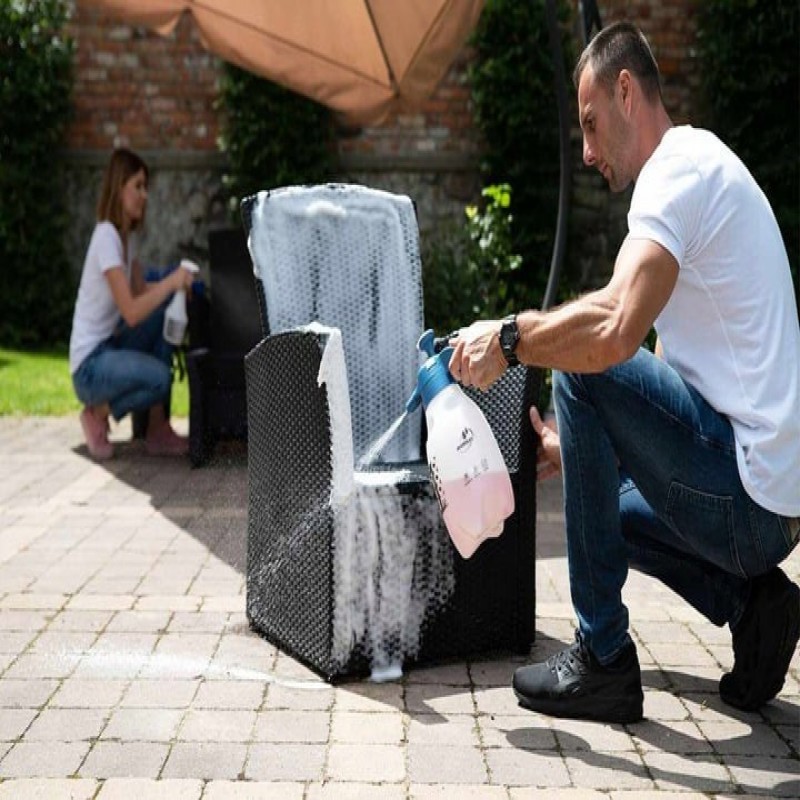 Піногенератор оснащений зручною ручкою, що замикається. Характеризується трьома типами густоти піни (у комплекті 3 різних насадки) та зручним загвинчуванням/відгвинчуванням бачка.